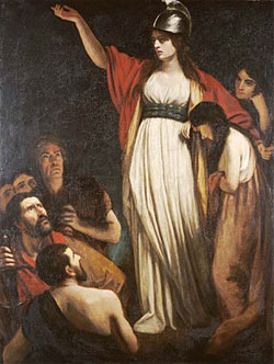 When she had finished speaking, she employed a species of divination, letting a hare escape from the fold of her dress; and since it ran on what they considered the auspicious side, the whole multitude shouted with pleasure, and Boudouica, raising her hand toward heaven, said: “I thank thee, Andraste, and call upon thee as woman speaking to woman; for I rule over no burden-bearing Egyptians as did Nitocris, nor over trafficking Assyrians as did Semiramis (for we have by now gained thus much learning from the Romans!), much less over the Romans themselves as did Messalina once and afterwards Agrippina and now Nero (who, though in name a man, is in fact a woman, as is proved by his singing, lyre-playing and beautification of his person); nay, those over whom I rule are Britons, men that know not how to till the soil or ply a trade, but are thoroughly versed in the art of war and hold all things in common, even children and wives, so that the latter possess the same valour as the men. As the queen, then, of such men and of such women, I supplicate and pray thee for victory, preservation of life, and liberty against men insolent, unjust, insatiable, impious – if, indeed, we ought to term those people men who bathe in warm water, eat artificial dainties, drink unmixed wine, anoint themselves with myrrh, sleep on soft couches with boys for bedfellows – boys past their prime at that – and are slaves to a lyre-player and a poor one too. Wherefore may this Mistress Domitia-Nero reign no longer over me or over you men; let the wench sing and lord it over Romans, for they surely deserve to be the slaves of such a woman after having submitted to her so long. But for us, Mistress, be thou alone ever our leader.”