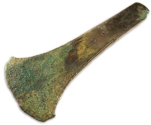 A large (today, 40-odd metres in diameter and over 3 metres high), un-ditched, bowl barrow, in the Normanton Down group of barrows, about half a mile to the south of Stonehenge. Bush Barrow (also known as Wilsford G5) was excavated in 1808 by William Cunnington and Sir Richard Colt Hoare. Beneath the mound was the skeleton of a man, described as “stout and tall”, laying, “from south to north”, on the original ground surface. He was accompanied by two bronze daggers (one of which disintegrated when disturbed), a copper dagger (the wooden handle of which had been inlaid with tiny gold pins[*]) that probably came from Brittany, possibly another bronze dagger (near the man’s head were found fragments of bronze and wood and bronze rivets), a bronze axe-head (its corrosion bears an imprint of cloth, in which it was, presumably, wrapped), a decorative stone mace-head (there are carved bone bands, which probably adorned the mace’s shaft), and three items of gold-sheet: a small diamond-shaped ‘lozenge’ (possibly another item of decoration from the mace’s shaft), a large (18cm x 15cm) ‘lozenge’ (it had been placed on the man’s chest and had had a wooden backing – its purpose is not clear), and a belt-hook (over 7cm square, it too had had a wooden backing).