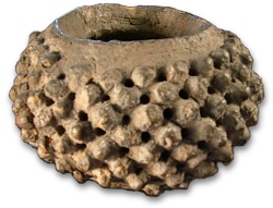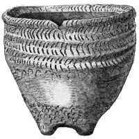 Food vessels are generally coarser and thicker than Beakers. To the modern eye they tend to have the look of ornamental plant-pots. They usually have, narrow, flat bottoms, but the one illustrated rightabove – 5½ inches high and about 6 inches across – from Weaverthorpe, in North Yorkshire, has four feet. Canon William Greenwell discovered it in a barrow: