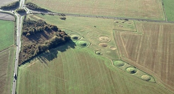 This group of barrows is about a mile to the west of Stonehenge. A Neolithic long barrow is at the top/left (actually, south-west) of the group in the photo (adjacent to the traffic roundabout). The rest are Bronze Age round barrows of various type.