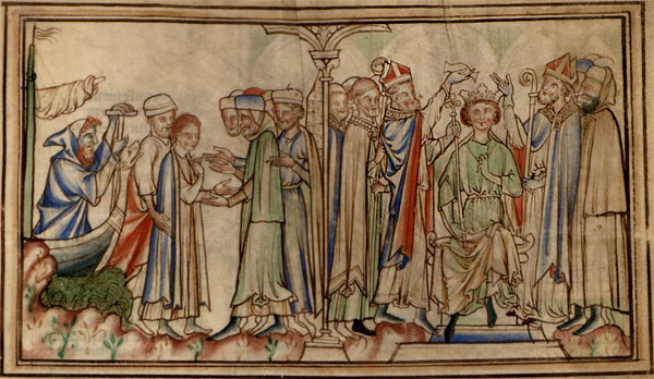 Also in the first quarter of 1050, Bishop Ealdred of Worcester and Bishop Hereman of Ramsbury travelled to Rome: “on the king’s errand” (MS C).[*] Presumably it was on the return journey that Ealdred met-up with Swein Godwinesson. Ealdred must have been persuaded that Swein was a reformed character, since he accompanied him back to England, and, says Florence of Worcester, “set him at peace with the king”. Swein was restored to his earldom.