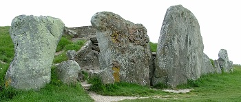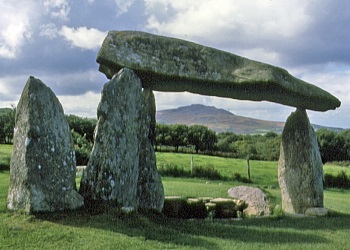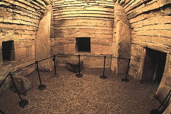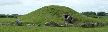 Another notable type of ‘chambered tomb’, found from Cornwall, through Wales and north-western Scotland (and, famously, in Ireland), to Orkney, is the ‘passage tomb’. In this type, a round mound covers a stone passage leading to central chambers. Well known British examples, dating from round-about 3000 BC, are Bryn Celli Ddu and Barclodiad y Gawres, both on Anglesey, and Maeshowe on Orkney Mainland.