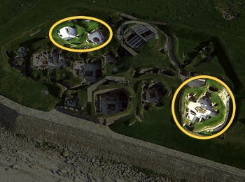 The full extent of the settlement is not known. Some (how much?) has been lost to erosion on the seaward side, and geophysical survey hints at unexplored remains inland. The buildings that can be seen at Skara Brae today are from two phases of development – of the ten buildings exposed, two belong to the earlier phase, Phase 1. In 2017, Bayesian-modelling, using the considerable number of Radiocarbon measurements by then available, suggested that Phase 1 was built round about 2900 BC, and was seemingly abandoned within a century[*]. The site was re-occupied in the 2700s BC, and Phase 2 was built over the flattened remains of Phase 1. Phase 2 was not built to the same plan as Phase 1 – it was not simply a house for house replacement – hence the visible remains of two houses from Phase 1. One of those earlier houses was heavily robbed out, perhaps to provide materials for new buildings. Sufficient is left of the other, however, to show that the new houses were similar in layout to the earlier houses, but larger.