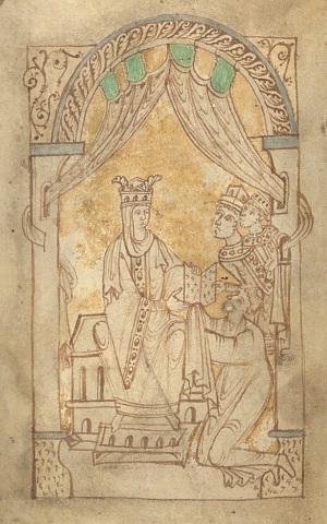 A surviving manuscript of the mid-11th century (British Library MS Additional 33241) has a depiction of Emma receiving the book from its author. The two onlookers are almost certainly her sons, Harthacnut and Edward.