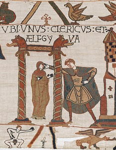The Bayeux Tapestry places this curious scene after Harold’s first arrival at William’s palace and before he and William depart for Brittany. The woman, perhaps a nun, appears to be being molested by a cleric. The caption simply says: “where one cleric and Ælfgifu”. The well endowed gentleman in the lower border, mimicking the cleric’s actions, seems to emphasize the improper nature of what is occurring. Presumably the meaning of this scandalous scene would have been well understood by a contemporary viewer, but today it is a puzzle.