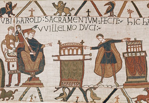 Edward, too, king of the English, by Divine disposition lacking an heir, had formerly sent Robert archbishop of Canterbury to the duke to nominate him as the heir to the kingdom which God had given him. Furthermore he afterwards sent to the duke Harold, the greatest of all the earls of his dominions in riches, honour and power, that he should swear fealty to him concerning Edward’s crown and confirm it with Christian oaths. Harold hastening to fulfil this mission, crossed the narrow seas …William of Jumièges (VII, 13)