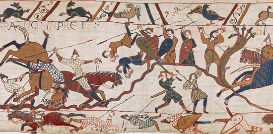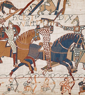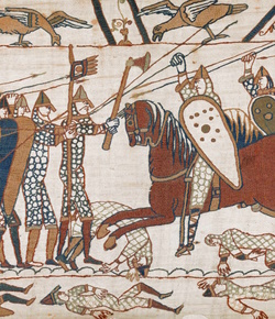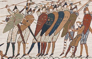 Preparing to meet the enemy, the king [Harold] mounted the hill and strengthened both his wings with noble men. On the highest point of the summit he planted his banner, and ordered his other standards to be set up. All the men dismounted and left their horses in the rear, and taking their stand on foot they let the trumpets sound for battle. The humble and God-fearing duke led a more measured advance and courageously approached the steeps of the hill. The foot-soldiers ran ahead to engage the enemy with arrows (against crossbow-bolts shields are of no avail). The helmeted warriors hastened to close ranks; on both sides the foemen raged with brandished spears.