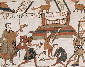 Building the castle at Hastings, depicted in the Bayeux Tapestry. It isn't entirely clear, but the figure on the left, directing operations, is probably Duke William’s half-brother, Count Robert of Mortain.