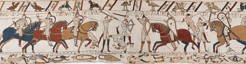 The Bayeux Tapestry (see above) places the deaths of Leofwine and Gyrth (the former is named by neither the Carmen nor William of Poitiers) early in the battle – before the fighting which precedes William lifting his helmet. Also, the Tapestry does not attribute Gyrth’s death to the duke himself.