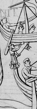 The figure depicted at the stern of William’s ship in the Tapestry, seems to correspond (though reversed) with a statue that the ‘Ship List’ says Matilda had fitted to the prow of Mora: “a child who with his right hand pointed to England and with his left hand held an ivory horn against his mouth.”