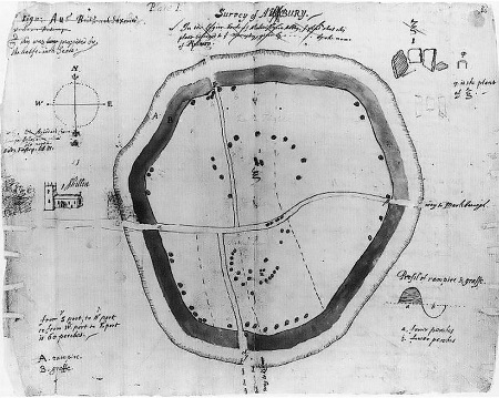 In the afternoon come to Abebury, where, seeing great stones like those of Stonage [Stonehenge] standing up, I stopped, and took a countryman of that town, and he carried me and shewed me a place trenched in, like Old Sarum almost, with great stones pitched in it, some bigger than those at Stonage in figure, to my great admiration: and he told me that most people of learning, coming by, do come and view them, and that the King did so: and that the Mount cast hard by is called Selbury [Silbury Hill], from one King Seall buried there, as tradition says.[*] I did give this man 1s [one shilling].