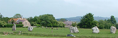 Avebury is about 17 miles north of Stonehenge. Even today its earthwork, enclosing an area roughly 350 metres in diameter, is impressive. [Plan] When built the bank would have been something like 27 metres wide at the base and 6 metres high. The ditch was 9 metres deep and some 14 metres wide at the top, tapering to less than half that at the bottom.[*] There were entrance causeways at the north, south, east and west. These breaks in the earthwork were, millennia later, adapted to carry the roads serving the village of Avebury, which inhabits the henge.