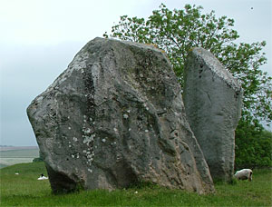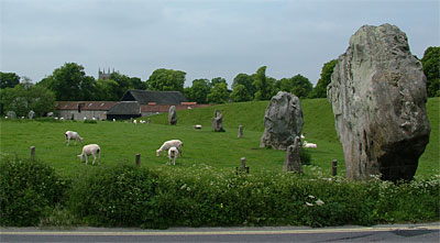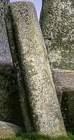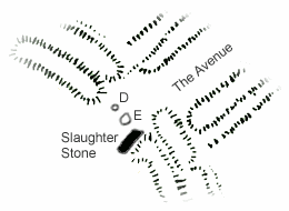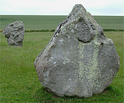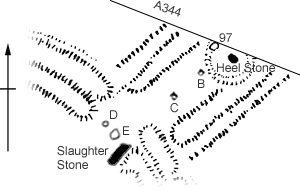 The, now recumbent (and colourfully named), Slaughter Stone is the sole remnant of a megalithic portal into the henge. Standing in the Avenue, but not on the centre-line, about 78 metres distant from the circle centre, is a massive unworked sarsen, called the Heel Stone.