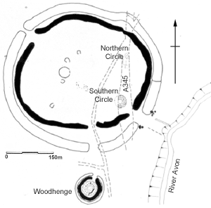By the end of 1724, all the stones had been removed, and the land ploughed over. The site was found, using Stukeley’s work as a guide, in 1930. When it was excavated, not only were there the holes from the two concentric stone circles sketched by Stukeley (the diameter of the outer circle is about 40 metres), but there were also holes for six concentric rings of timber posts. Interpreting the building sequence of this monument continues to keep archaeologists entertained. It has been suggested that the postholes are the remains of roofed buildings (the same has been said of Woodhenge’s posthole rings), but it is probably fair to say that most archaeologists today are inclined to the view that they held free-standing posts. Possibly the posts had timber lintels, or perhaps they were decorated in the fashion of totem-poles.