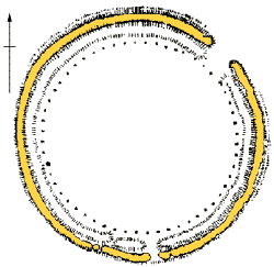 A basic henge is simply a, roughly, circular space, enclosed by a ditch and bank earthwork, with an entrance, or entrances, leading to the centre. As a rule (there are, of course, exceptions), the bank is built up on the outside of the ditch – an arrangement usually regarded as being unsuitable for defensive purposes. Most henges contained various types of feature – for instance, arrangements of stones, timbers or pits.