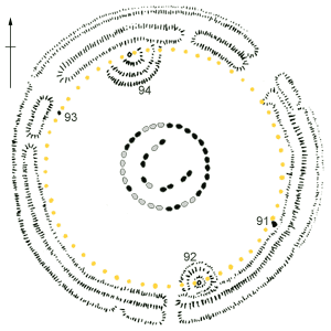 The five remaining stones of the Southern Inner Circle, with the smaller stones of the Z Feature behind. Concrete plinths mark empty stoneholes.