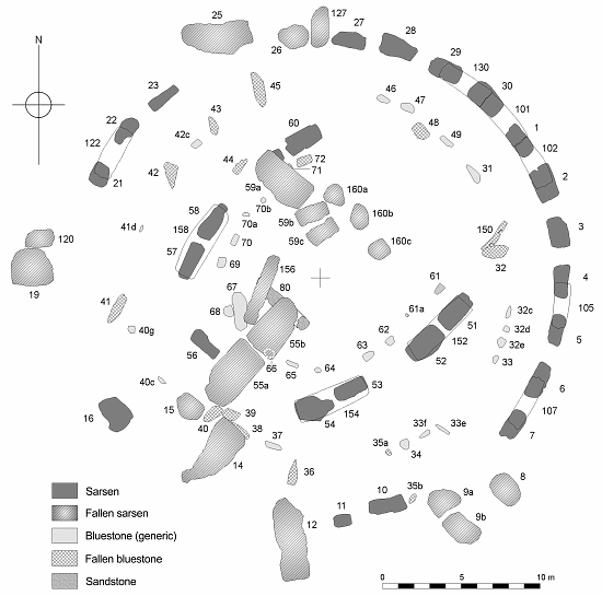 STAGE 4, c.2200 BC. Round about 2200 BC, bluestones were arranged in a circle, running inside the sarsen circle. According to the SRP’s proposed sequence, the bluestones of this new circle had, until this time, stood in the Q and R Holes (the previous notion was that they had been removed from the site when the sarsens were installed, only to be brought back at this time). The small bluestone circle inside the sarsen trilithon horseshoe, assuming there was such a structure, was apparently restyled into an oval.[*] No actual stones are now present at the north-eastern end of the oval (though there are stoneholes), and it has been supposed they were removed in prehistoric times in order to produce a bluestone horseshoe setting that echoed the sarsen trilithon setting. It is perhaps the most controversial proposal of the SRP that this bluestone horseshoe did not exist. Based on the observations of Timothy Darvill and Geoffrey Wainwright, made during their 2008 excavation, it is suggested that the missing stones were robbed in Roman, and later, times, and that the prehistoric setting was always an oval.