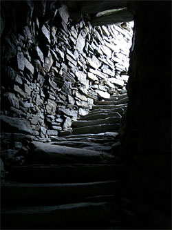 The towers are entered by a single, low, doorway and have no windows. This somewhat featureless exterior, combined with the slope of the wall, has led to them being likened to power station cooling towers. The entrance passage usually has a, so called, ‘guard-cell’ to one side, within the wall’s thickness. Presumably (though not proven), the towers would have had a number of wooden upper floors and a conical roof – certainly, typical features of ‘broch architecture’ are ‘scarcements’, i.e. stone ledges, around the inside of the tower which could have provided support for an internal timber structure. The name ‘broch’ is derived from the Old Norse borg, i.e. ‘fortress’, and these substantial towers would, no doubt, act as a stronghold when raiding parties attacked. They are, however, very prominent in the landscape. They were, clearly, built to be impressive. It does not seem unreasonable to see them as status symbols – blatantly advertising the wealth of the family who lived there. Their heyday would appear to span four hundred years, the last two centuries BC and the first two AD.