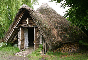 The ‘roundhouse’ is the classic Iron Age dwelling – generally between 5 and 15 metres in diameter, with wattle and daub walls. It is assumed that the walls would have been at least chest height, to allow maximum use of the enclosed space. Since the walls were round, the roof was conical, with a timber framework and a covering of thatch (or possibly turf, which, being heavier, would require more support). Often, the house’s entrance, which might have a porch, perhaps for reasons of belief rather than any purely practical consideration, faces south-east, towards the midwinter sunrise, or east, towards sunrise at the equinox.