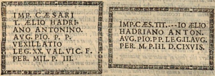 … the territory of STERLING, so named of the principall towne therein … Heere is that narrow land or streight by which Dunbritton Frith and Edenborrough Frith (that I may use the termes of this age), piercing farre into the land out of the West and East Seas, are divided asunder, that they meete not the one with the other… Antoninus Pius, who beeing adopted by Hadrian bare his name, stiled thereupon TITVS ÆLIVS HADRIANUS ANTONINVS PIVS, under the conduct of Lollius Vrbicus, whom he had sent hither Lieutenant, repelled the Northern enemies backe againe beyond BODOTRIA or Edenborrough Forth, and that by raising another wall of turfe, namely beside that of Hadrianus, as Capitolinus writeth. Which wall, that it was reared in this very place, whereof I now speake, and not by Severus (as it is commonly thought) I will produce no other witnesses than two ancient inscriptions digged up here, of which the one, fastened in the wall of an house at Cader, sheweth how the second Legion Augusta, set up the wall for the space of three miles and more: the other, now in the house of the Earle Marshall at Dunotyr, which implieth that a band of the twentieth legion Victrix raised the said wal three miles long. But see here the very inscriptions themselves as Servatius Riheley, a Gentleman of Silesia who curiously travailed these countries, copied them out for mee: