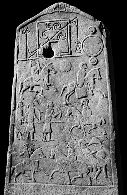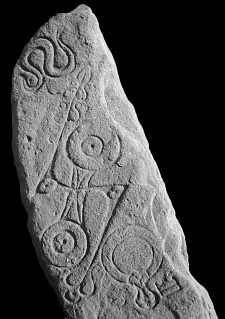 What type of language the Picts spoke has (like every other facet of Pictish history) long been the subject of scholarly conjecture. There is little information to go on – mainly place-names and personal-names, but there are also inscriptions. The Picts have left a legacy of elaborately carved standing-stones, some apparently engraved with ogham inscriptions – ogham being a writing-system, where a character is defined by the number and orientation of straight strokes relative to a stem-line, which seems to have originated in Ireland in the 4th century. St Columba’s biographer, Adomnán, says (VC II, 32) that Columba, an Irishman, needed an interpreter to preach to the Picts, and the Pictish inscriptions have defied satisfactory translation.[*] To cut a very long story short, the majority view seems to be that the Picts spoke a P-Celtic language. The intractability of what appears to be ogham writing on stones has, however, encouraged the notion that they are in a pre-Celtic remnant language (similar to Basque). It is not only the ogham aspect of Pictish carved stones which has been the subject of scrutiny. There is repeated use of certain designs, known as ‘Pictish symbols’, which it is believed must have meaning, but what that meaning is has, so far, also resisted would-be code-breakers.
